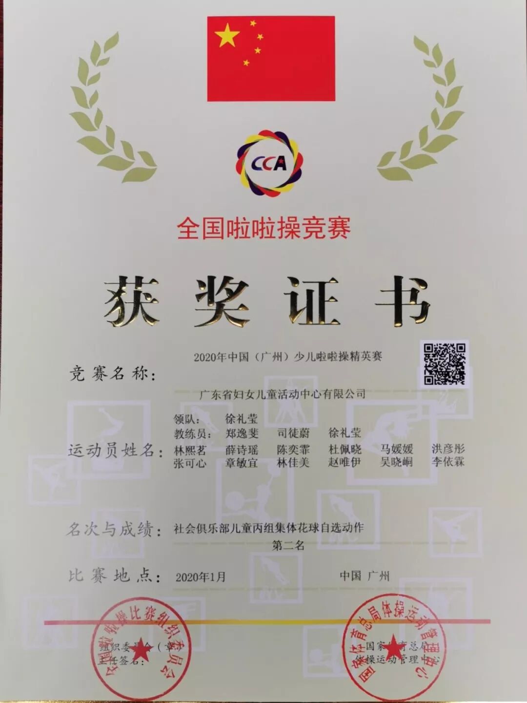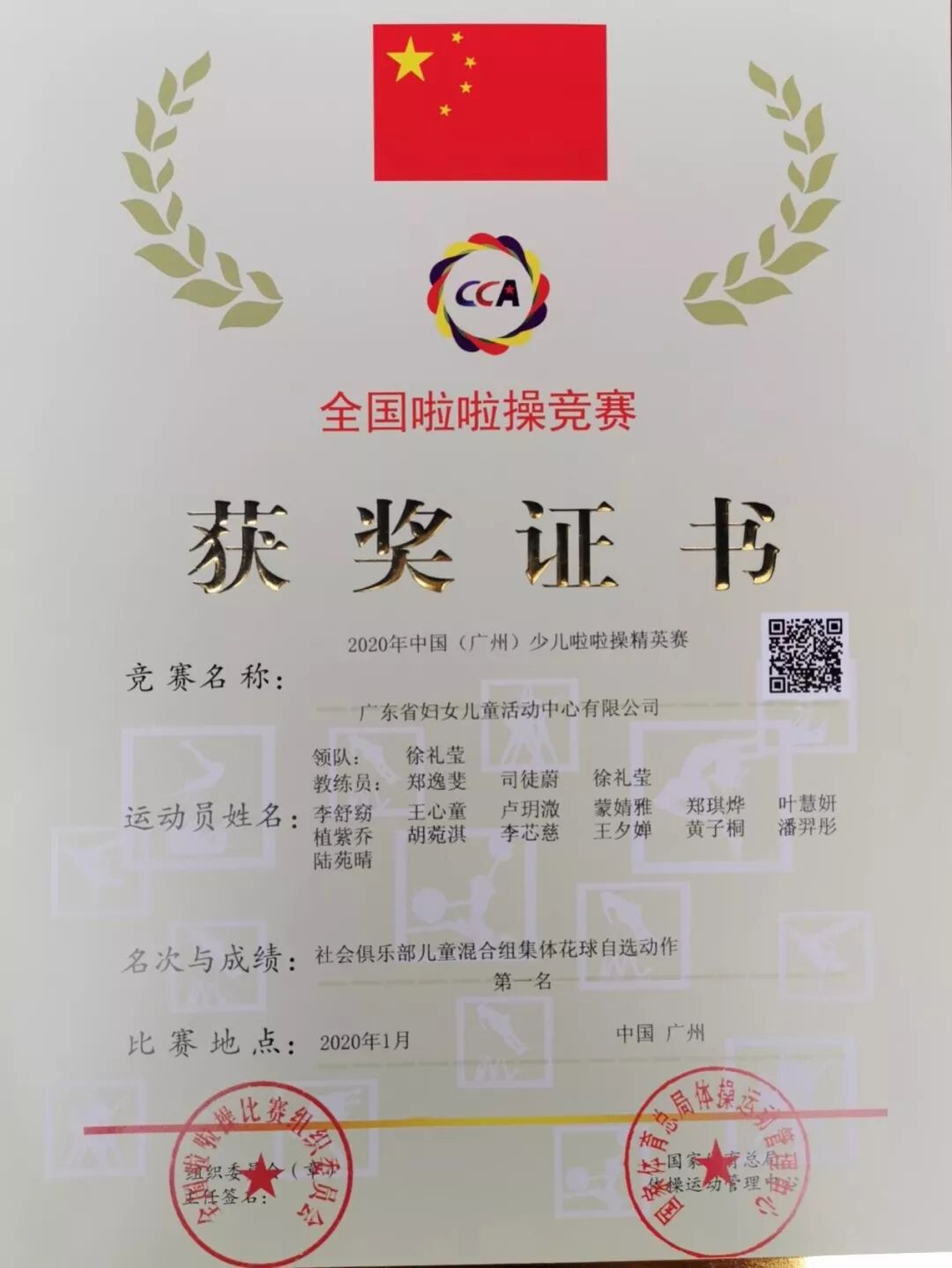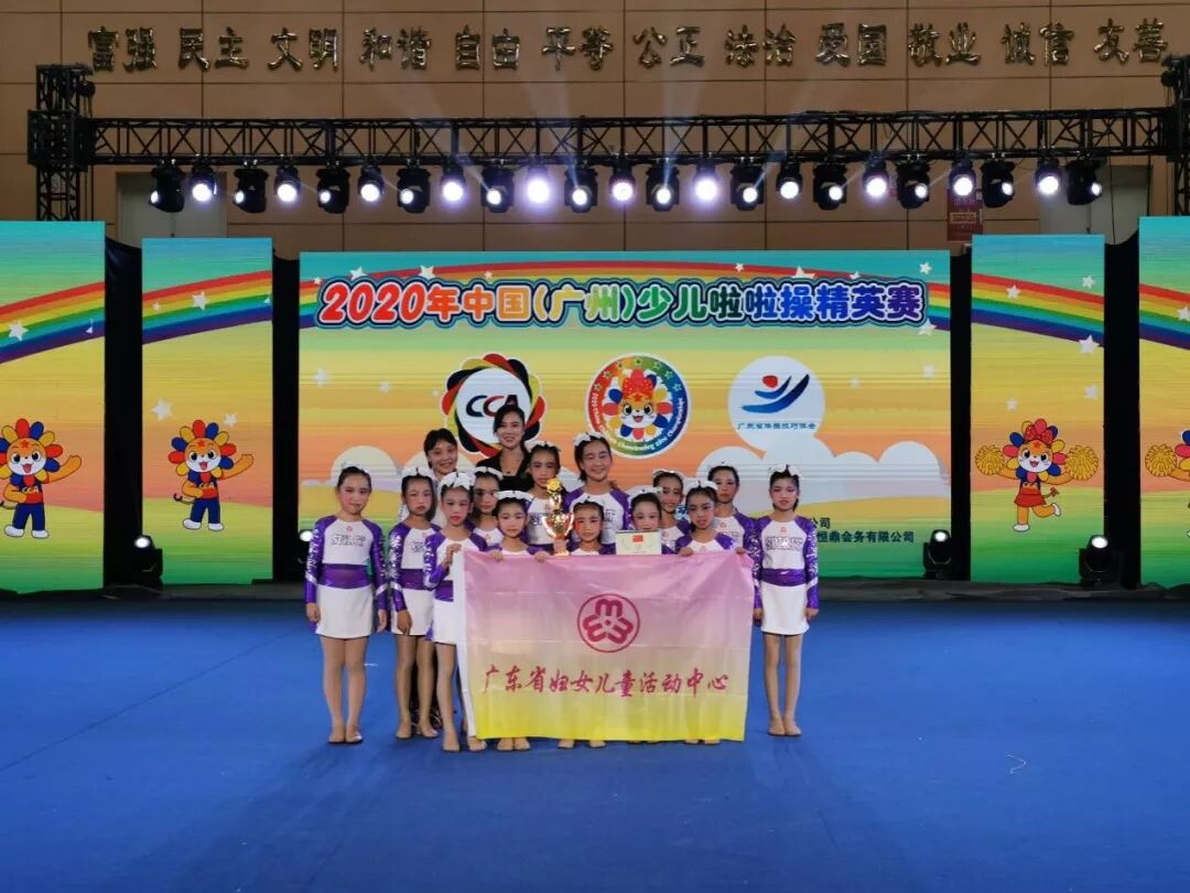 2020年全國(guó)(廣州)少兒啦啦操精英賽于2020年1月3日至5日,在廣州體育職業(yè)技術(shù)學(xué)院盛大舉行。本次賽事由國(guó)家體育總局體操運(yùn)動(dòng)管理中心主辦,賽事吸引了來(lái)自中小學(xué)、幼兒園和社會(huì)俱樂(lè)部的62支隊(duì)伍1300名運(yùn)動(dòng)員參賽。廣東省婦女兒童活動(dòng)中心派出兩支隊(duì)伍,共25名隊(duì)員出戰(zhàn)本次賽事,獲得一個(gè)第一名,一個(gè)第二名的好成績(jī)。